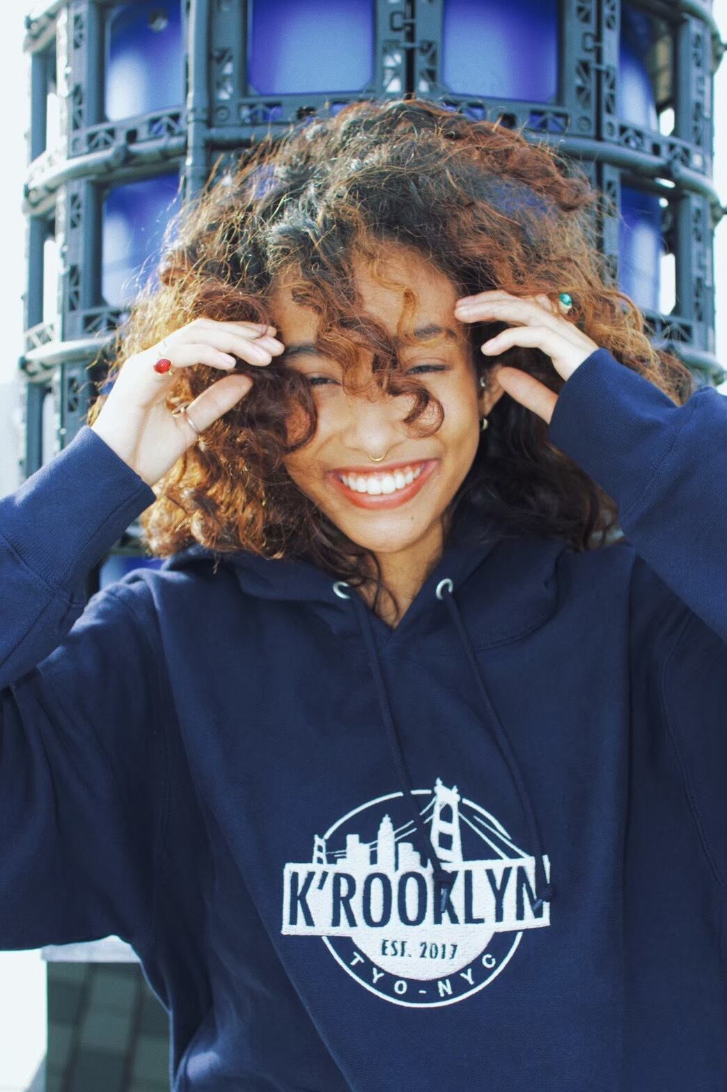 K’rooklynのブリッジロゴを前面にプリントしたパーカー。